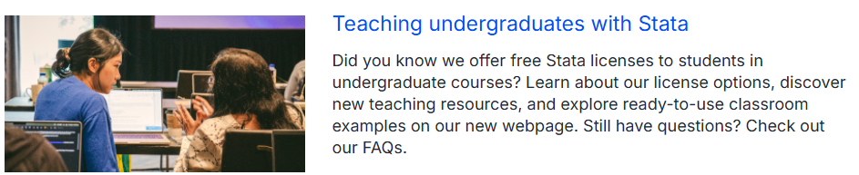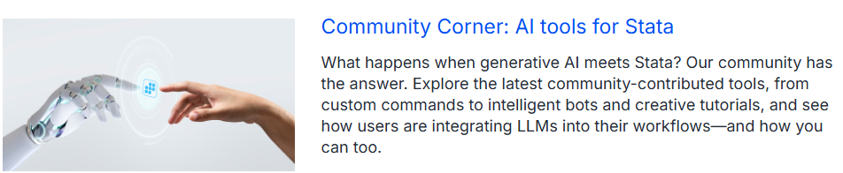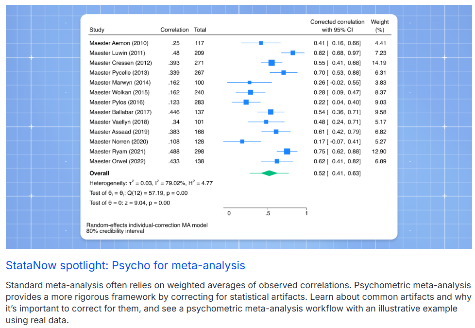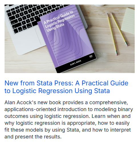 Pelajari psychometric meta-analysis. Ada buku baru dari Alan Acock tentang A Practical Guide to Logistic Regression Using Stata. Bagaimana hasilnya jika kita menggunakan AI tools? Cari tahu mengenai on-demand webinars yang cocok untuk kalian. Dan jangan lupa kami menyediakan free Stata untuk membantumu mengajar Undergraduate Student (mahasiswa S1). Dan masih banyak lagi pada Stata News kali ini.